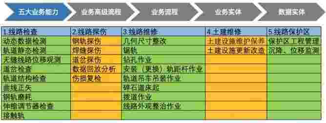 在轨道运维业务中,,,我们形成了完整的从业务能力(业务域)-业务流程-业务实体-数据模型的分析梳理过程。。。轨道运维业务能力如下图所示::::